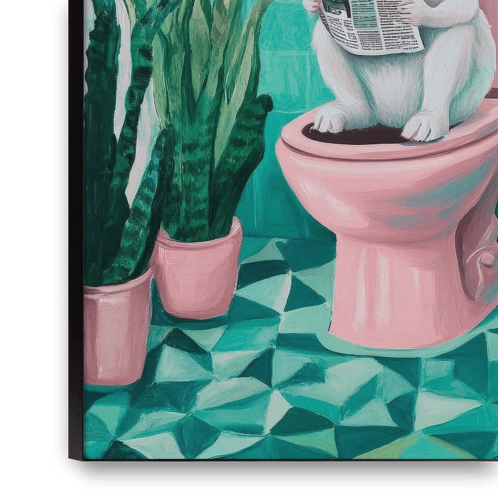 In einer fantastischen, pastellfarbenen Welt sitzt ein entspannt aussehender Hase auf einer rosa Toilette und blättert in einer Zeitung. Umgeben von üppigen Pflanzen, strahlt diese Szenerie eine humorvolle Leichtigkeit aus. Ideal für das Badezimmer, bringt dieses Bild einen Hauch von Lebensfreude und Kreativität in einen oft übersehenen…