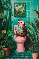 Ein charmantes, humorvolles Kunstwerk, das einen pelzigen Besucher in einer grünen Oase zeigt, der entspannt eine Zeitung liest. Der kontrastrierende rosa Toilettensitz bringt einen spielerischen Touch in diese tropische Szenerie. Ideal für das Badezimmer, verwandelt es jeden Raum in ein unkonventionelles Refugium voller Persönlichkeit.