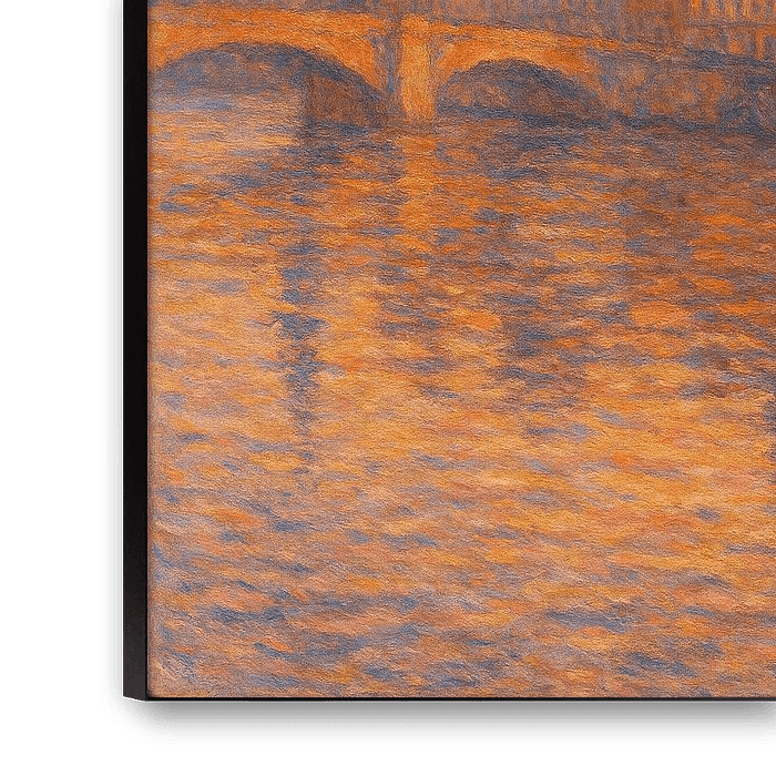 Dieser von Monet inspirierte Druck von Lyon bei Sonnenuntergang zeigt den historischen Charme der französischen Flussuferarchitektur, die in glühendes Abendlicht getaucht ist. Für Sammler, die europäische Stadtansichten und warme, atmosphärische Töne schätzen, fängt dieses Kunstwerk die Magie der goldenen Stunde ein, die die Stadt in eine leuchtende Palette von Orangen, Rosatönen und gedämpften Violetttönen verwandelt. Die Basilika Notre-Dame de Fourvière krönt schwach den Hügel im Hintergrund und verankert das Werk in der unverwechselbaren Skyline von Lyon.