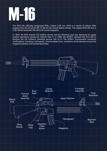 Das M16 (bekannt als Gewehr, Kaliber 5,56 mm, M16) ist die militärische Bezeichnung der Vereinigten Staaten für das AR-15-Gewehr On Blueprint