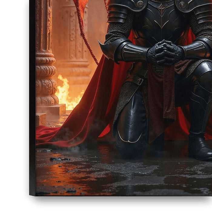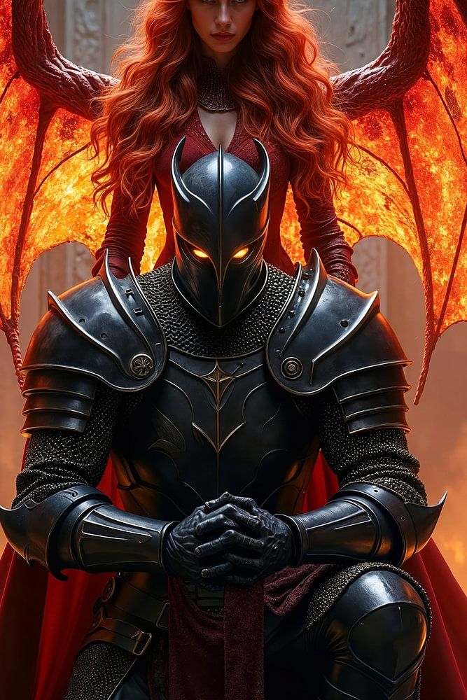 Eine geflügelte Dämonin mit flammend roten Haaren erhebt sich hinter einem knienden schwarzen Ritter, dessen Rüstung kalt und schwer im Feuerschein glänzt. Ihre ausgebreiteten Schwingen leuchten wie glühende Glut, während Hörner und Blick unmissverständlich Macht und Kontrolle ausstrahlen. Hinter ihnen erhebt sich eine monumentale…