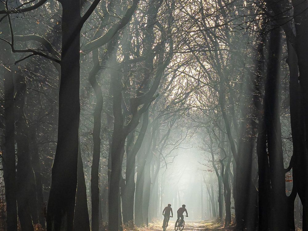 Früh aufstehen und ab in den Wald. Es riecht dann so gut und ist immer noch so herrlich ruhig. Als ich einen Weg entlangging, sah ich 2 MBTer, die sich näherten. Im Gegenlicht und mit der Sonne, die durch den Dunst scheint, ein magischer Moment, bevor sie im Wald verschwinden.