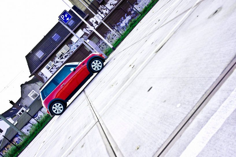 MINI Cooper Pepper 2002 Rood, op parkeerplaats met op de achtergrond een spoorbaan en met graffiti bekladden bedrijfspanden. Urban-stijl