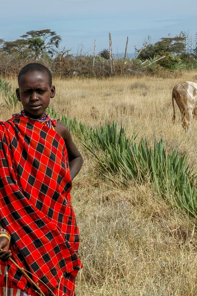 In Kenia, in den Loita-Ebenen, hütet ein Maasai-Mädchen Vieh. Sie ist mit der traditionellen Shuka gekleidet.