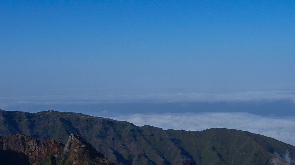 Madeira - Berg Pico do Arieiro mit roten Felsen und Wolken unter Panorama-Landschaftsansicht mit blauem Himmel