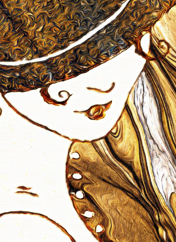 Abstraktes Fantasieporträt einer Frau im Retrostil. Gemälde in Mischtechnik, hauptsächlich in Braun- und Goldtönen.