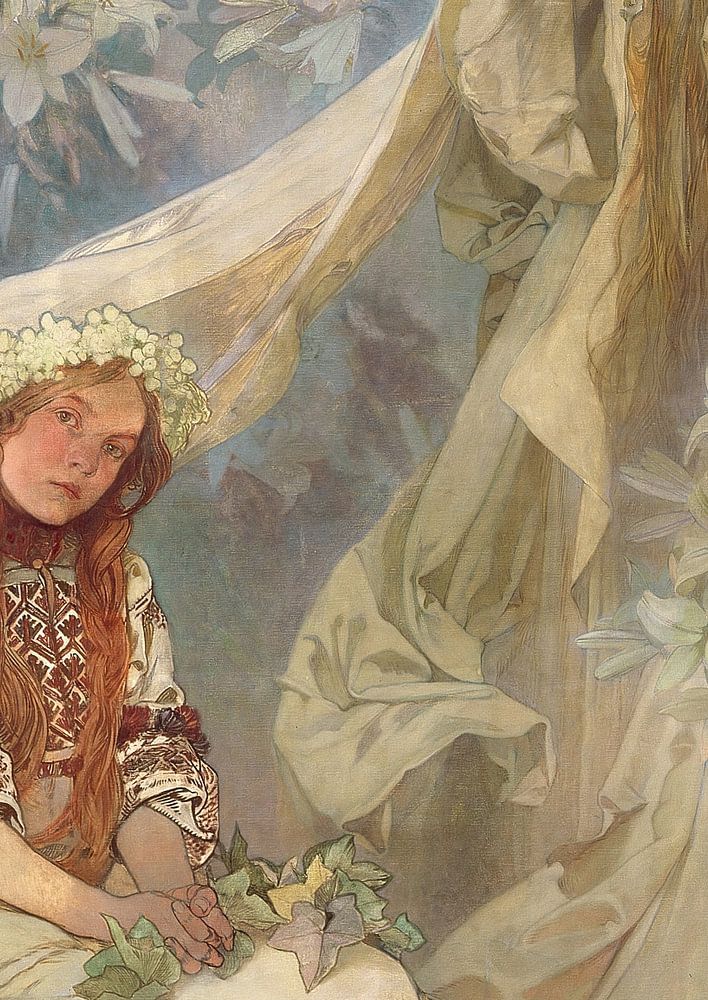 Lilienmadonna, Alphonse Mucha (1905) Alfons Maria Mucha, international bekannt als Alphonse Mucha, war ein tschechischer Maler, Illustrator und Grafiker, der zur Zeit des Jugendstils in Paris lebte und vor allem für seine stark stilisierten und dekorativen Theaterplakate, insbesondere die von Sarah Bernhardt, bekannt wurde. Er schuf Illustrationen, Werbungen, dekorative Tafeln und Entwürfe, die zu den bekanntesten Bildern dieser Zeit gehören.