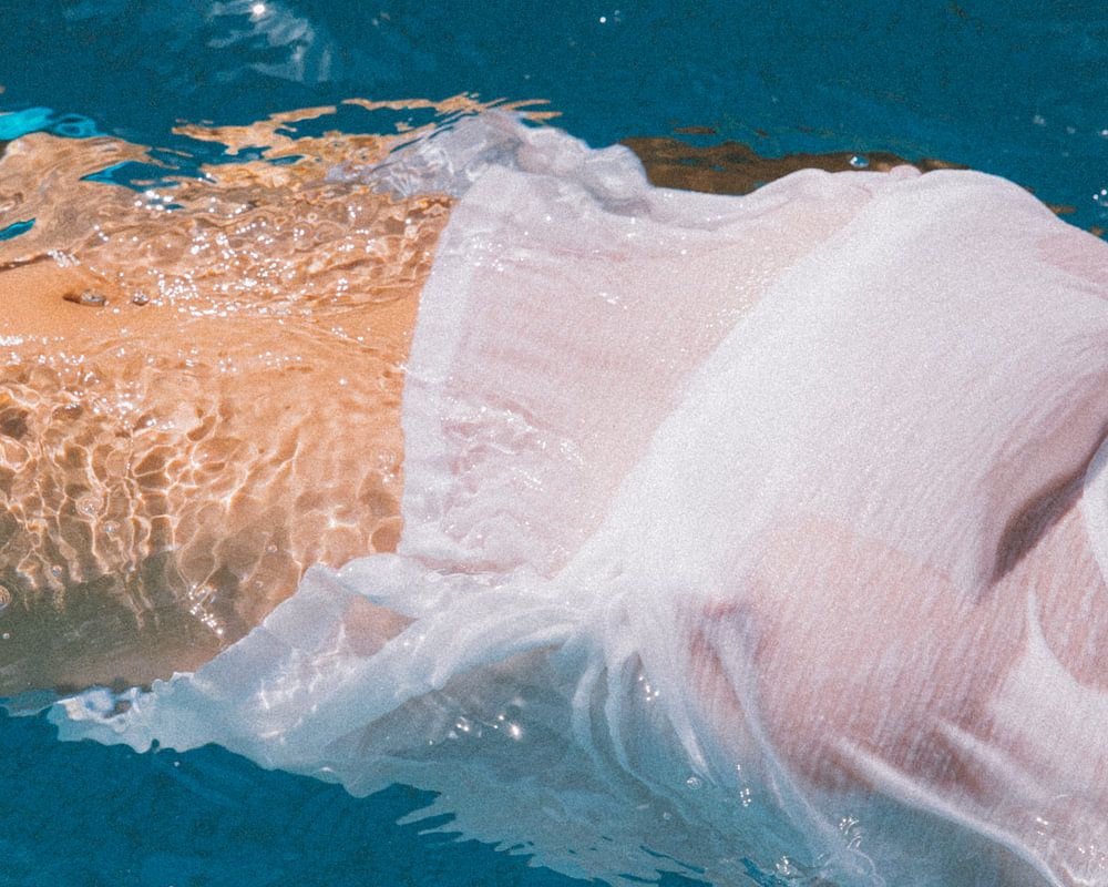 Farbfoto von Mädchen im Bikini und T-Shirt im Pool.