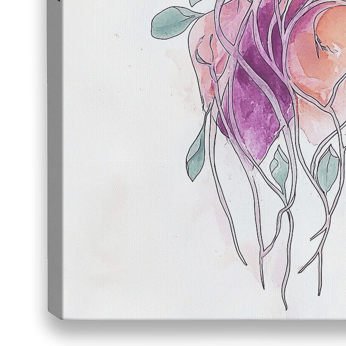 Ein gezeichnetes Porträt zeigt ein Mädchen, dessen Gesicht und Körper auf subtile Weise mit den Elementen der Erde verwoben sind. Ihr Haar fließt in Wurzeln und Zweige, während Teile ihrer Haut mit Erde und Blättern bedeckt sind. Das Porträt strahlt eine tiefe Verbundenheit mit der Natur aus.