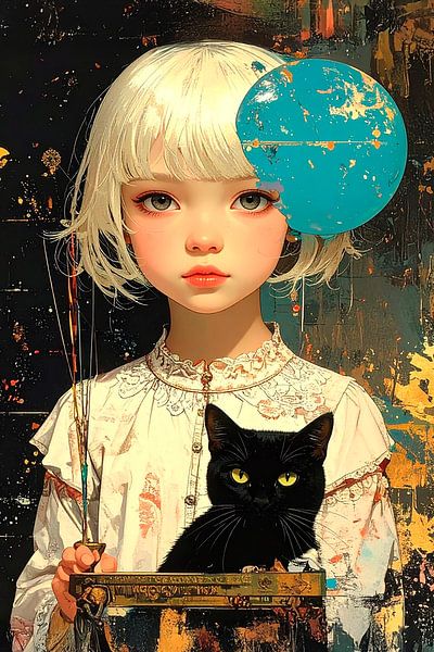 Ein hübsches Mädchen mit kurzen blonden Haaren hält eine schwarze Katze in ihren Armen. Neben ihr schwebt ein blauer abstrakter Ballon, der Hintergrund hat eine gold-schwarze Textur mit Farbspritzern. Ein surrealistisches Gemälde im Pop-Art-Stil. Das Bild wurde mit ai erstellt.