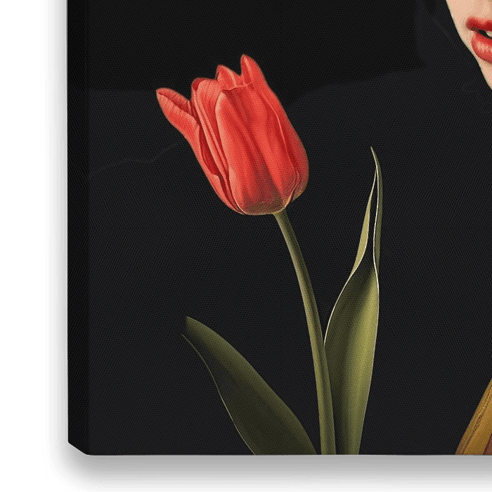 Bestelle dieses Blumen-Wandbild Mädchen mit Perle und Tulpe von Vlindertuin-Art als Reproduktion auf Leinwand, Alu-Dibond, als Poster, Fototapete oder Acrylglasbild.