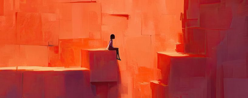 Mädchen und Orange | Sitzendes Mädchen vor abstraktem Hintergrund - Dieses abstrakte Gemälde zeigt ein Mädchen, das auf einem großen, orangefarbenen Stein sitzt, umgeben von einem warmen, hellen Hintergrund.