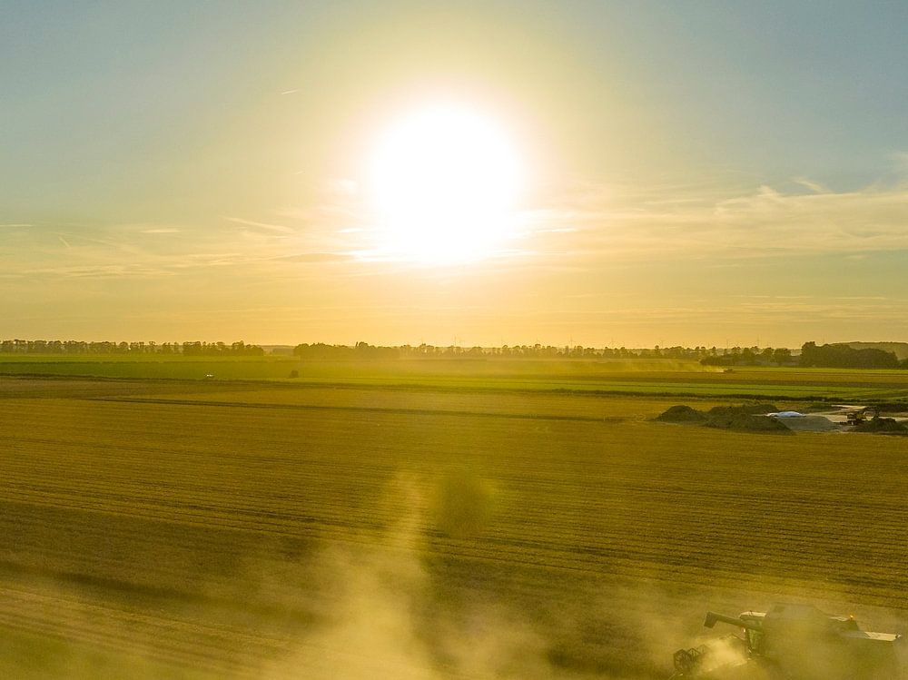 Mähdrescher bei der Weizenernte auf einem goldfarbenen Feld während des Sonnenuntergangs im Sommer von oben gesehen. Während dieser Dürreperiode wirbelt der Mähdrescher Staub auf.