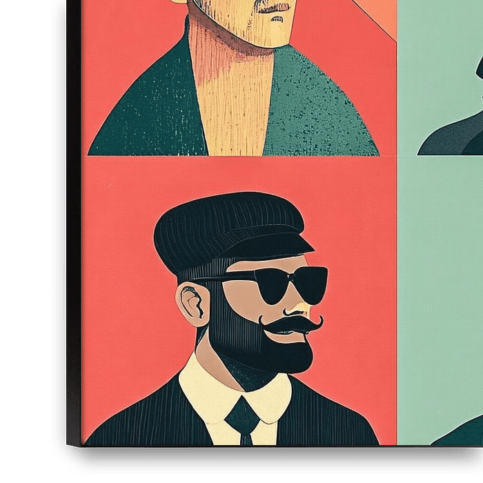Dieses Design zeigt eine Reihe stilvoller Männer, die verschiedene Hüte und Sonnenbrillen tragen - perfekt für ein modernes Interieur. Das geometrische Layout mit auffälligen Farben macht es zu einer ausgezeichneten Wahl für alle, die Retro-Chic und zeitgenössische Kunst lieben. Die Verwendung heller Farben und eine minimalistische…