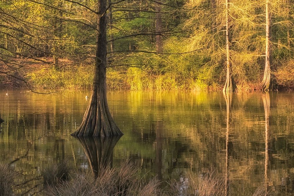 Schöne, große und stattliche Bäume im Wasser. Es handelt sich um Sumpfzypressen mit schönen Stämmen am Rande des Wassers.