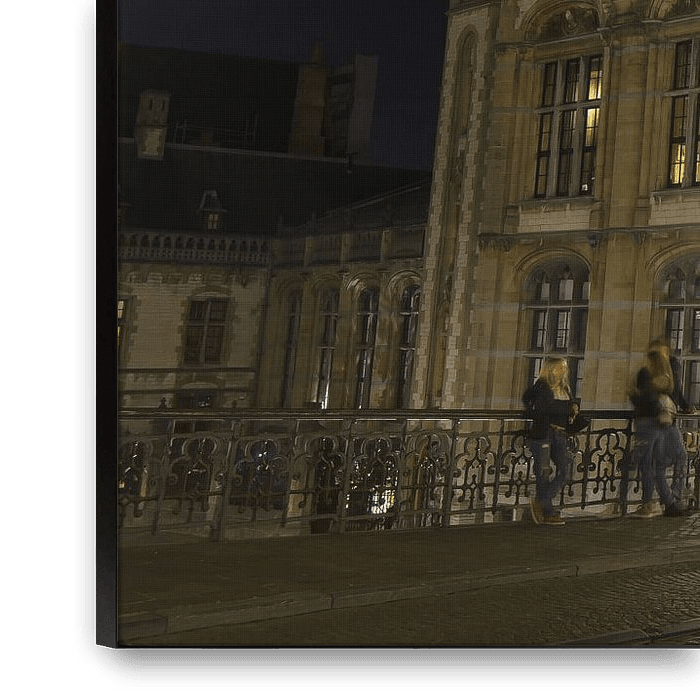 Stimmungsvolles und märchenhaftes Abendfoto des Lagerhauses auf dem Korenmarkt in der fotogenen und historischen belgischen Stadt Gent, aufgenommen von der St.-Michael-Brücke über den Fluss Leie.