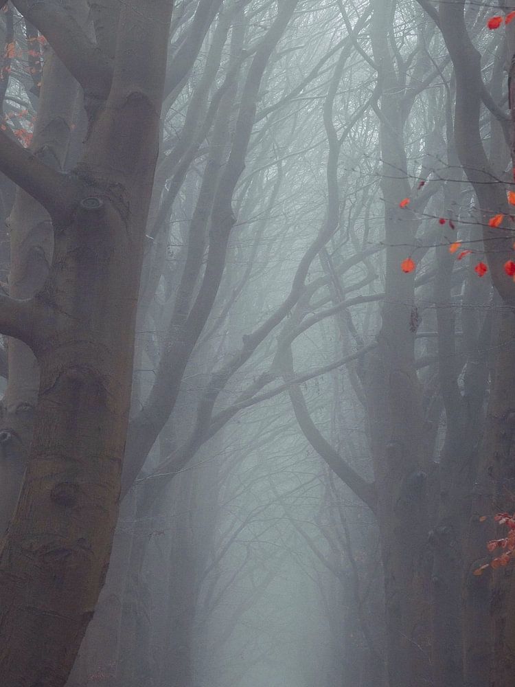 An einem schönen nebligen Morgen in Friesland. Ein Spaziergang durch einen Märchenwald mit schönen hohen Bäumen.