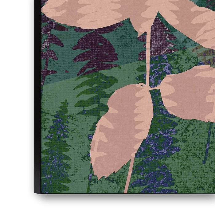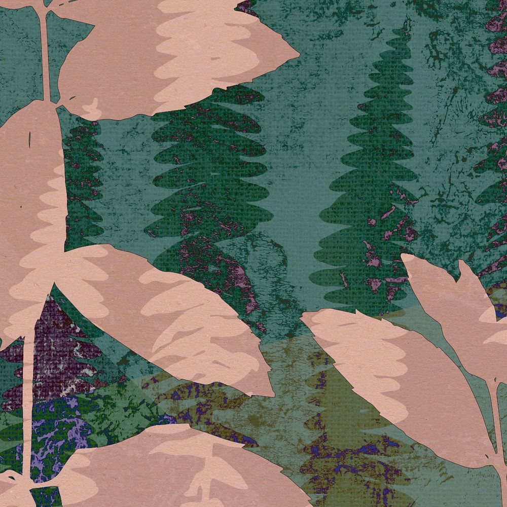 Dieses minimalistische abstrakte botanische Kunstwerk zeigt tiefe Grüntöne, strukturierte Rindeneffekte und subtile moosige Oberflächen, die das Gefühl vermitteln, durch einen ruhigen Wald zu spazieren. Farnblätter und einfache Blattsilhouetten erscheinen als abstrakte Formen und natürliche Linien auf einem von Wabi-Sabi inspirierten Hintergrund mit erdigen Unregelmäßigkeiten, was dem Werk einen geerdeten und organischen Look verleiht. Ideal für skandinavische, japandische und eklektische Innenräume.