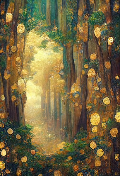 Ein farbenfrohes digitales Gemälde eines Märchenwaldes im Stil von Gustav Klimt. Dieses Werk ist von den Formen und der Farbpalette von "The Kiss" inspiriert. Das Werk verleiht Ihrer Einrichtung eine warme und klassische Note!