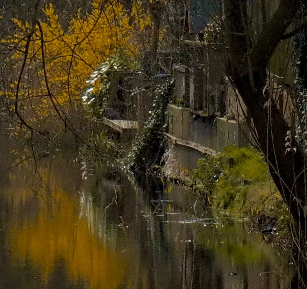 Der Baum scheint sich mit aller Kraft zwischen dem alten Schuppen und dem kleinen Steg, an dem einst ein Boot ankerte, festhalten zu wollen.