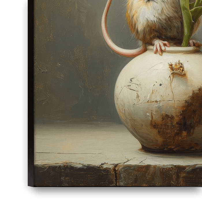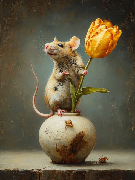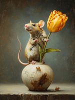 Bestelle dieses Stilleben Mäusefreund mit goldener Tulpe von But First Framing als Kunstdruck auf Leinwand, Alu-Dibond, als Poster, Fototapete oder Acrylglasbild.