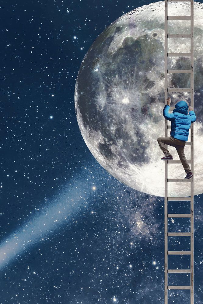 Das Bild zeigt einen Jungen, der mutig die Leiter hinaufklettert, mit dem Ziel, den Mond zu erreichen und sogar darüber hinaus zu gehen. Der dunkle, mit Sternen übersäte Himmel bildet einen schönen Kontrast zu der hellen Leiter und dem strahlenden Mond. So entsteht eine visuell atemberaubende Szene, die den Betrachter auf eine Reise der Träume und der Fantasie mitnimmt.