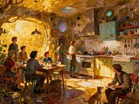 Dieses detailreiche Gemälde zeigt eine lebendige Küchenszene voller Kreativität, Wärme und Fantasie. Mehrere Menschen sitzen oder stehen in einem gemütlichen Raum, während im Hintergrund gekocht und gearbeitet wird. Die Küche ist von warmem Licht durchflutet und mit ungewöhnlichen dekorativen Elementen geschmückt, darunter runde…