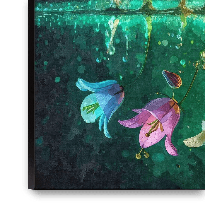Dieses digitale Kunstwerk zeigt eine Reihe fantasievoller, multicolorierter Blumen, die aus einer spiegelnden Wasseroberfläche emporsteigen. Die leuchtenden Blüten in Blau, Pink, Gelb und Violett interagieren dynamisch mit dem Wasser, erzeugen Spritzer und Reflexionen und schaffen eine perfekte Symmetrie. Der Hintergrund aus grünen,…