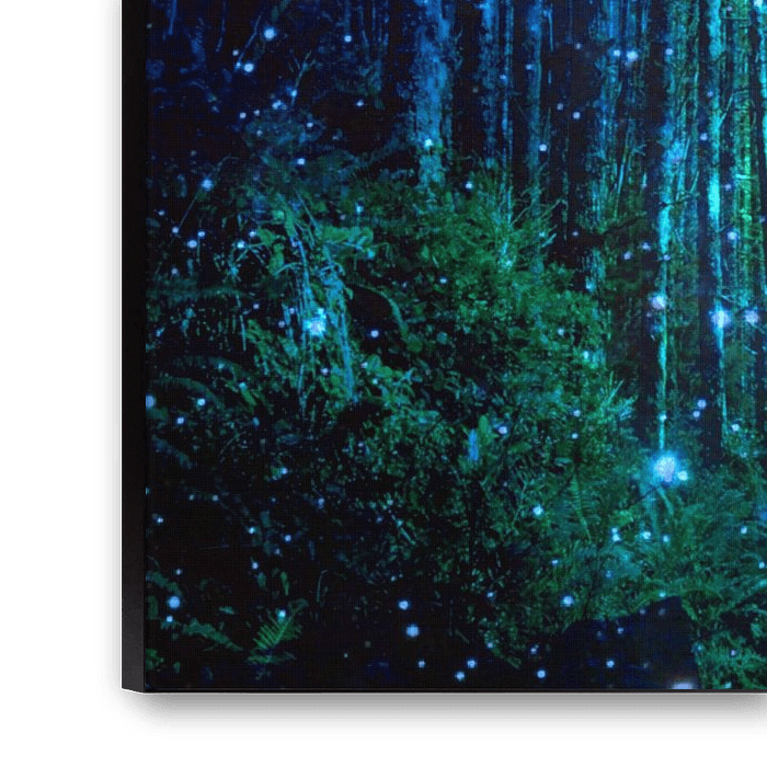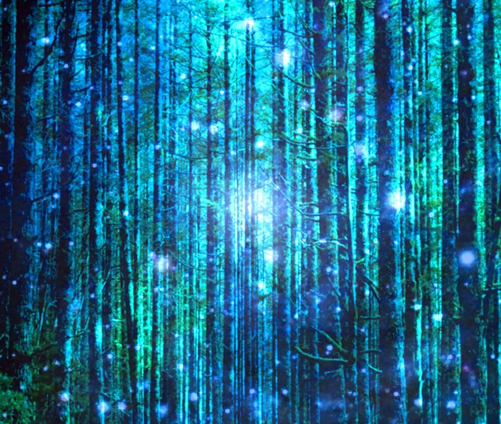 Magischer Wald mit hohen Bäumen und Glühwürmchen