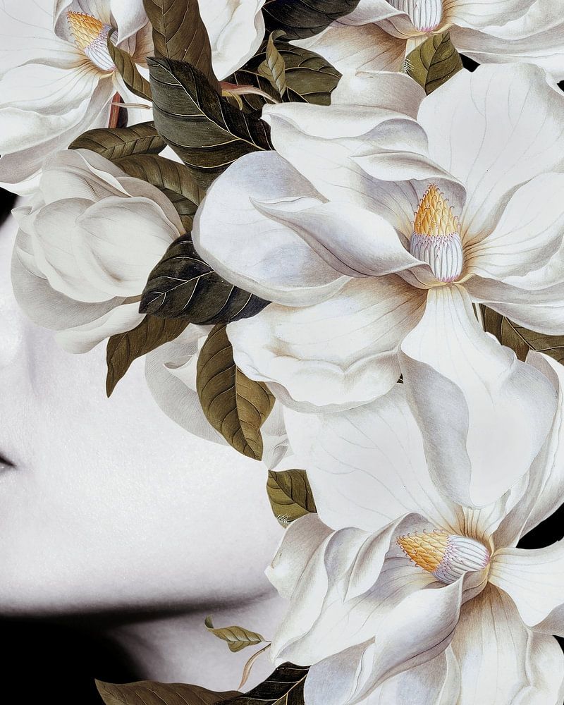 Digital erstellte Collage, die moderne und alte Kunst kombiniert. Ein surreales und romantisches Porträt einer Frau, umgeben von Magnolien, auf schwarzem Hintergrund.