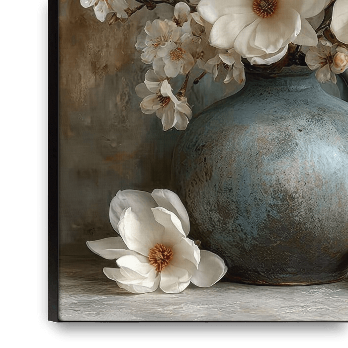 Dieses raffinierte Magnolienstillleben zeigt zarte Magnolienblüten in einer robusten Keramikvase in warmem, diffusem Licht. Die gedämpften Farben und malerischen Texturen schaffen eine ruhige, zeitlose Atmosphäre. Ein elegantes Kunstwerk, das Harmonie und Sanftheit in ein stilvolles Interieur bringt.