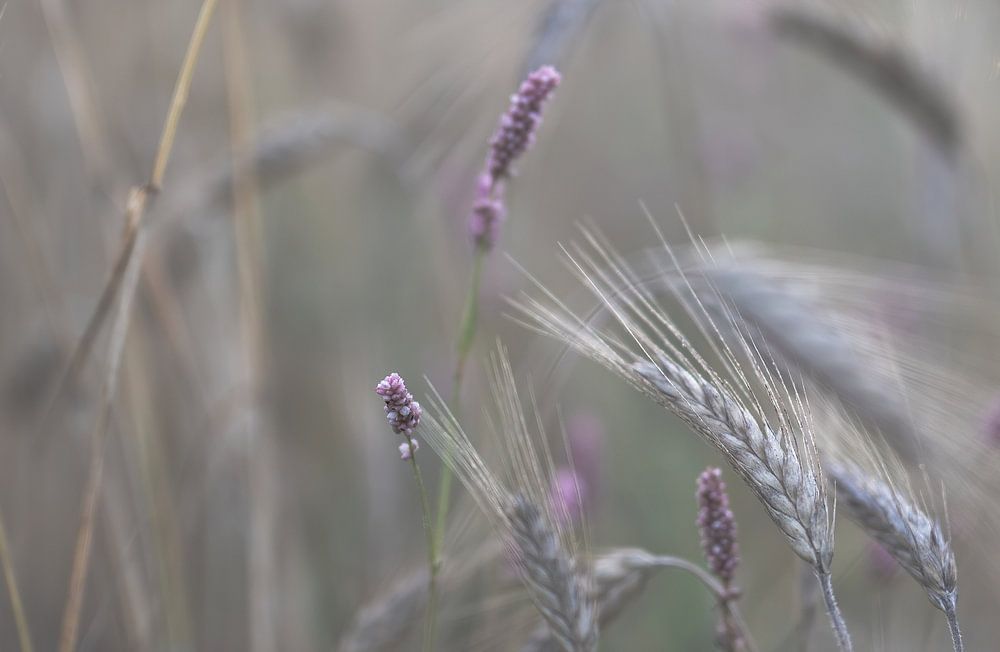 Nahaufnahme von Weizenähren, hier und da eine rosafarbene Wildblume, mit einer weichen Pastellfotobearbeitung.