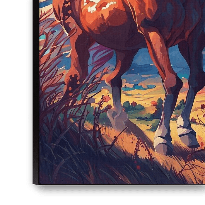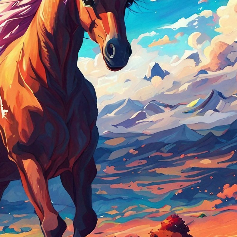 In dem fesselnden Pferdebild fängt der Künstler die zeitlose Schönheit und den edlen Geist der Pferdewelt ein. Das prächtige Pferd, das in seiner ganzen Pracht dargestellt ist, steht stolz vor einem Hintergrund aus sanften Hügeln und gedämpftem Sonnenlicht.