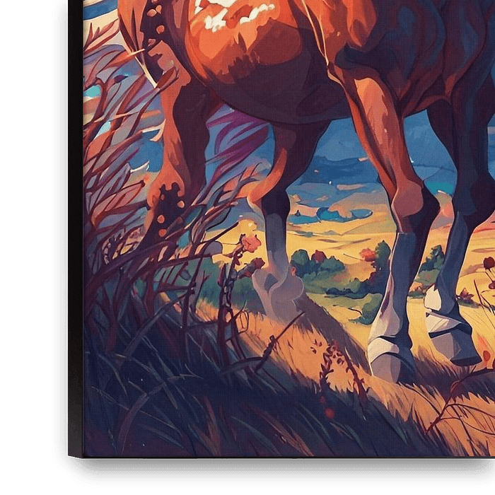 In dem fesselnden Pferdebild fängt der Künstler die zeitlose Schönheit und den edlen Geist der Pferdewelt ein. Das prächtige Pferd, das in seiner ganzen Pracht dargestellt ist, steht stolz vor einem Hintergrund aus sanften Hügeln und gedämpftem Sonnenlicht.