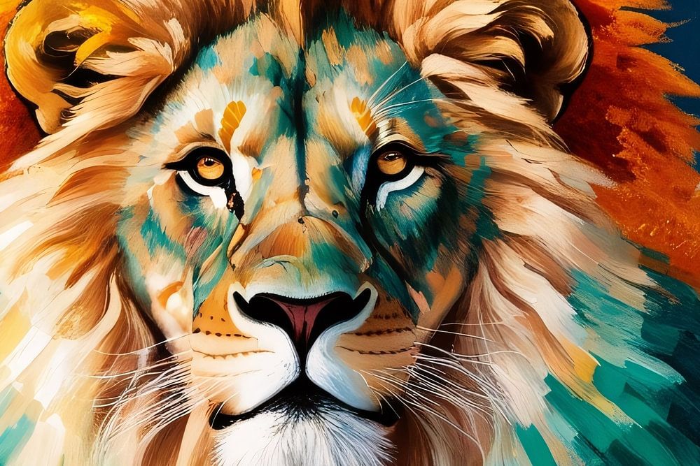 Dieses Design zeigt einen majestätischen Löwen mit einem lebendigen und künstlerischen Aussehen. Die satten Farben und die raffinierte Verwendung von Linien verleihen dem Löwen eine dynamische, fast traumhafte Ausstrahlung. Die Kombination aus leuchtenden Farbtönen wie Gelb, Orange, Blau und Grün erinnert an eine Explosion von Energie und Kraft. Der Hintergrund mit detaillierten Mustern und floralen Elementen unterstreicht die Eleganz und Stärke des Tieres und macht es zu einem Blickfang für jeden Raum. Das Design kombiniert moderne und klassische Elemente und ist eine perfekte Ergänzung für ein Büro oder ein Wohnzimmer. Es bringt sowohl Ruhe als auch Energie in den Raum, ideal für Tier- und Kunstliebhaber.