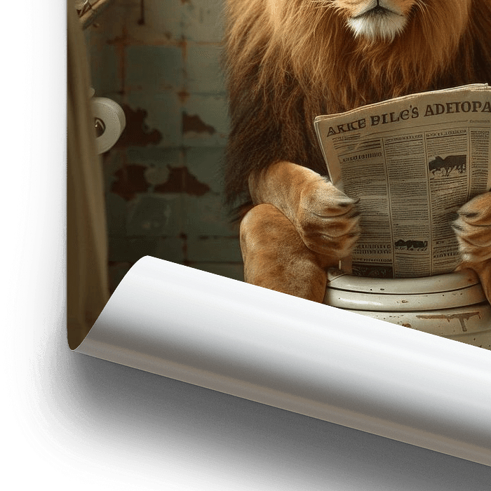 Ein majestätischer Löwe sitzt auf einer Toilette und liest entspannt die Zeitung in einem Retro-Badezimmer.