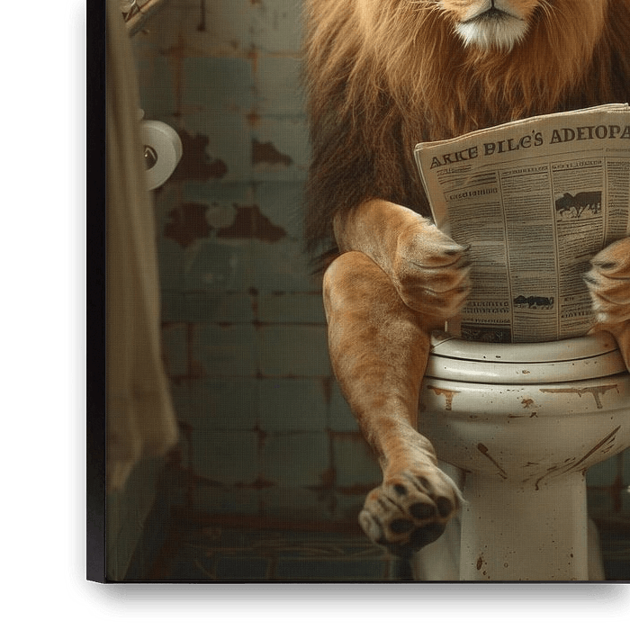 Ein majestätischer Löwe sitzt auf einer Toilette und liest entspannt die Zeitung in einem Retro-Badezimmer.
