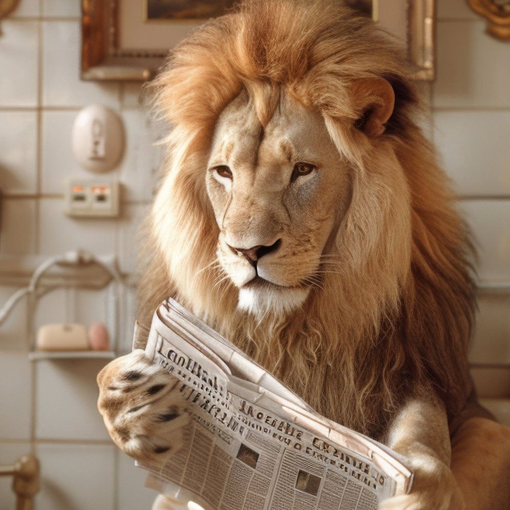 Ein Löwe als König der Tiere sitzt humorvoll auf einer Toilette und liest entspannt die Zeitung.