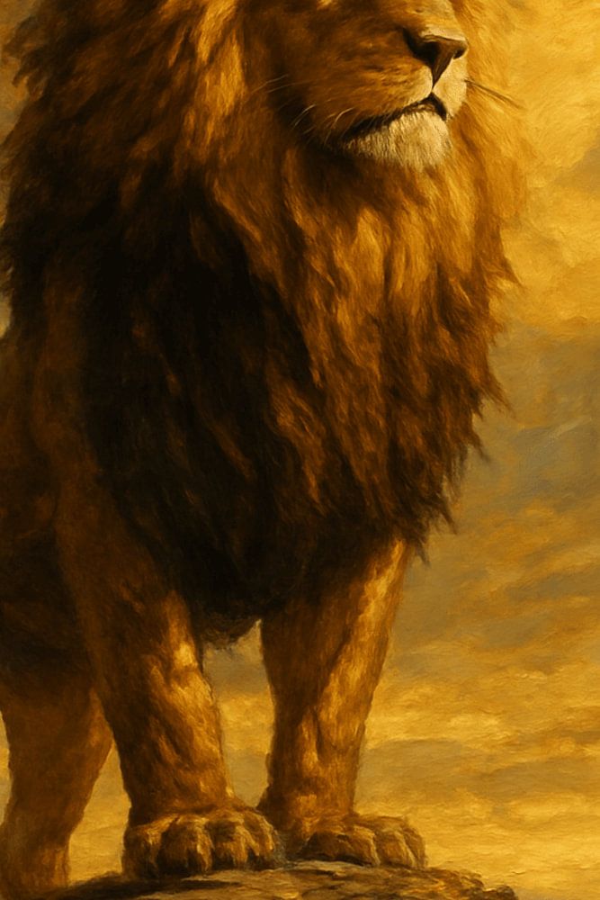 Jeder ausdrucksstarke Pinselstrich und jedes strukturierte Impasto-Detail spiegeln die rohe Energie und den edlen Geist des Königs der Wildnis wider. Erdige Brauntöne, tiefes Gold und warme Bernsteinfarben verschmelzen harmonisch mit gedämpften Blautönen und schaffen ein atemberaubendes Gleichgewicht zwischen Ruhe und Kraft.