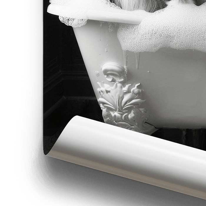 Dieses imposante Badezimmerbild zeigt einen majestätischen Löwen, der in seiner Badewanne ruht und Ihrem Badezimmer eine besondere Aura verleiht. Die Schwarz-Weiß-Fotografie fängt die Erhabenheit des Löwen ein und betont die Details der Szene, während es gleichzeitig eine charmante und einzigartige Ergänzung für Ihre…