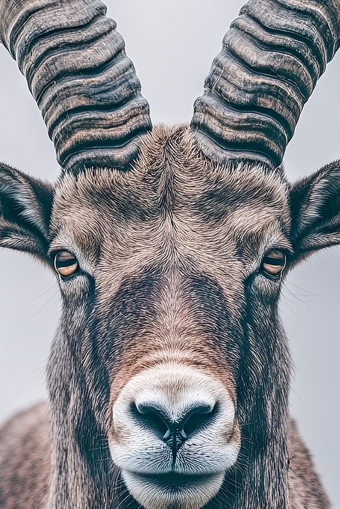 Majestätisch und kraftvoll blickt das Tier mit seinen imposanten, spiralförmigen Hörnern direkt in die Kamera. Die sanften, aber entschlossenen Augen strahlen eine uralte Weisheit aus, während das dichte, raue Fell die Rauheit seines Lebensraumes widerspiegelt. Eine elegante Präsenz, die die Schönheit und Stärke der Natur verkörpert.