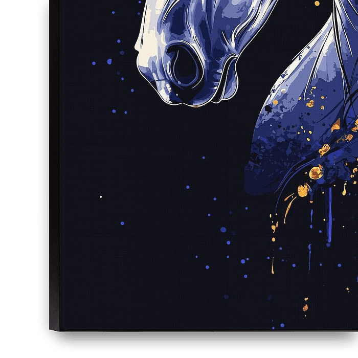 Das kunstvolle Porträt eines Pferdes fängt mit dynamischen Pinselstrichen und kontrastreichen Farben die Eleganz und Kraft des Tieres ein. Die dominierenden Blautöne verleihen dem Bild eine kühle, geheimnisvolle Ausstrahlung, während goldene Akzente für Wärme und Ausdrucksstärke sorgen. Die abstrakten Farbspritzer und sanften…