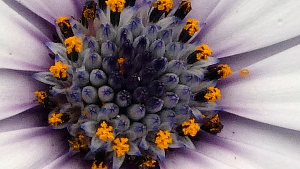 Dieses digitale Poster zeigt die stille Perfektion der Natur in einer Nahaufnahme, die sonst dem menschlichen Auge verborgen bleibt: Das Zentrum einer zarten weißen Blüte mit lilafarbenem Verlauf, eingefangen in beeindruckender Makroschärfe. Jedes Detail – von den samtigen Blütenblättern über die violetten Röhrenblüten bis hin zu den goldgelben Pollenpunkten – erscheint plastisch und greifbar. Die Aufnahme zieht den Blick unweigerlich in die Mitte der Blume, wo sich Ordnung, Symmetrie und Farbspiel zu einem hypnotisierenden Naturmuster verbinden.