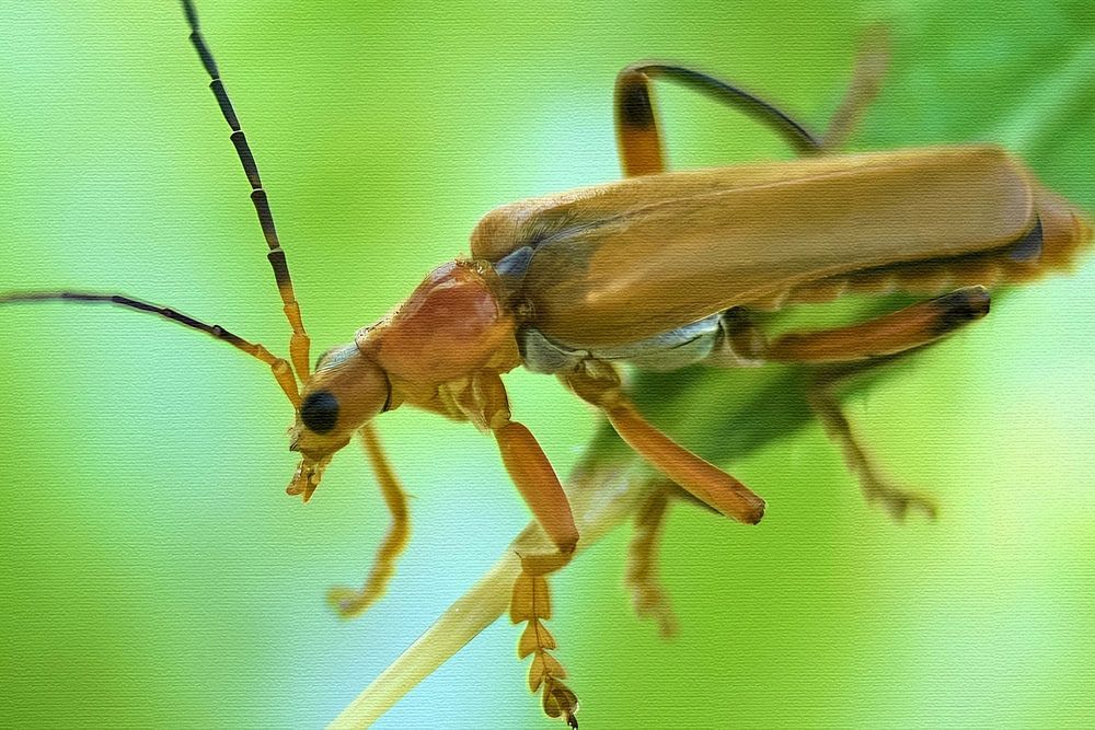 Der unscharfe Hintergrund macht die Details des Käfers im Vordergrund besonders gut sichtbar.