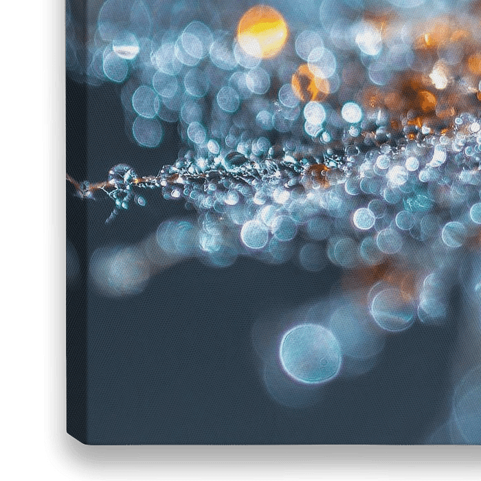 Farbige Wassertröpfchen auf einem Fussel mit viel Bokeh