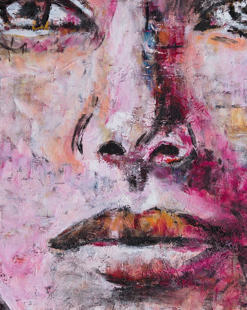 Ein Gemälde des Gesichts einer Frau. Ein eindringliches Porträt, gemalt von Anja Namink. Es besteht aus mehreren Schichten von Ölfarbe.