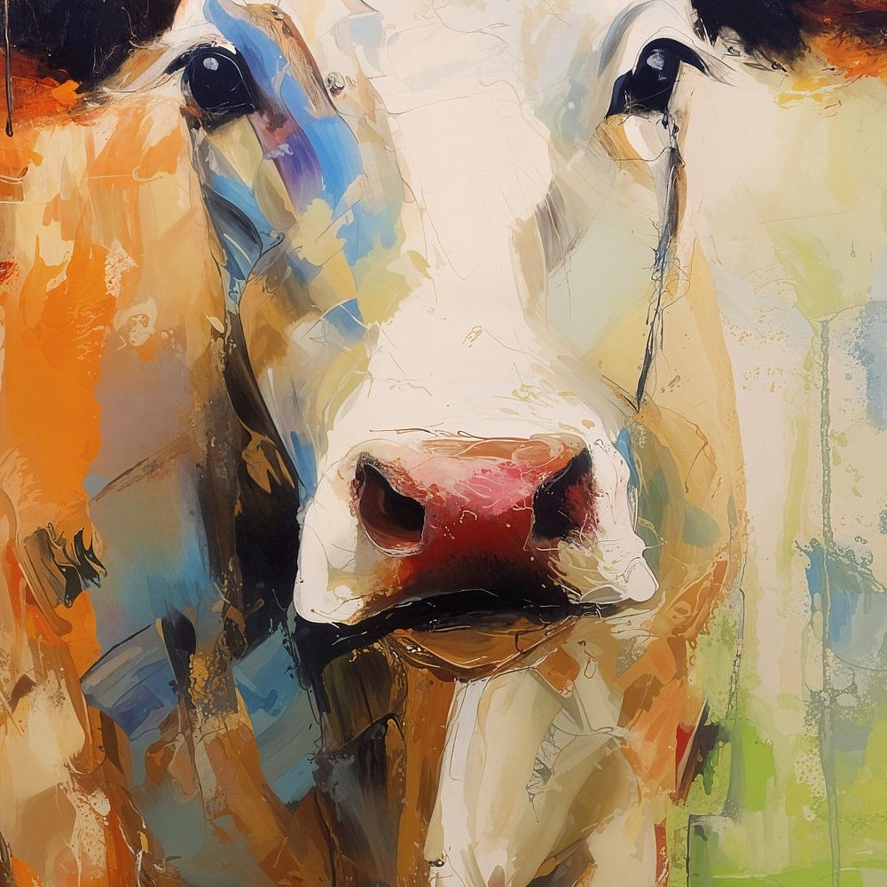 Der Hintergrund in hellen Grün- und Cremetönen vermittelt ein Gefühl der Gelassenheit und des Friedens. Er strahlt eine ruhige und entspannte Atmosphäre aus und lädt den Betrachter ein, die Welt der Kuh mit einem Gefühl der Ruhe und Harmonie zu erkunden.