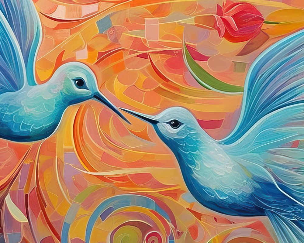 Gemälde Lebendige Kolibris | Himmlisches Ballett Duo - tanzende Kolibris, bunte Blumenpracht