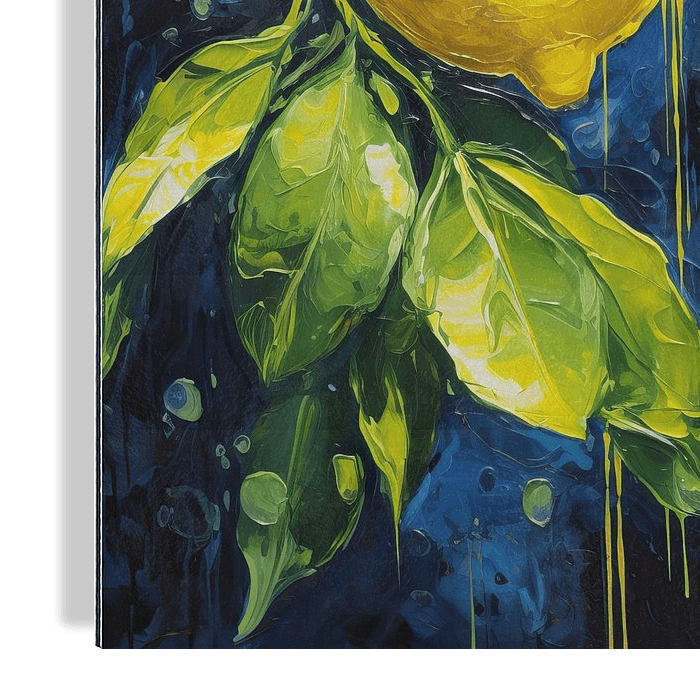 Im Mittelpunkt dieses Gemäldes steht eine funkelnde Zitrone, die in intensiven Gelbtönen dargestellt ist und mit dem dunklen Hintergrund in tiefem Schwarz und Blau kontrastiert.