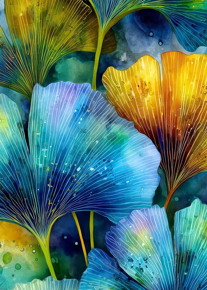 Dieses Aquarell zeigt mehrere Ginkgoblätter in einer vertikalen Komposition. Die Blätter sind mit einer leuchtenden Mischung aus gelben, grünen und blauen Farbtönen gefärbt, die ein farbenfrohes und auffälliges Bild ergeben.
